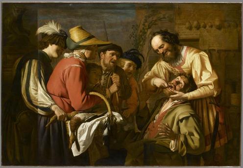 A proximité d’un verger dans lequel elle se faufilait discrètement, cherchant à se remémorer ce qui lui était le plus utile, elle entendit des voix et des cris. Curieuse comme elle était, son attention partit par là. Cela l’intéressa. Elle s’approcha et put voir. Dans une échoppe ouverte au vent, plusieurs personnes étaient rassemblées autour d’une autre qui se lamentait horriblement. C’était un barbu de la bouche de qui un arracheur de dents, tout sourire et lui aussi fameusement barbu, extrayait un chicot pourri qui empuantissait son haleine et, surtout, lui faisait souffrir la mort, l’empêchant même de s’alimenter (37). C’est ce que La Louvre entendit dire par un de ceux qui regardaient la scène avec un certain effarement, une certaine anxiété qu’une pareille chose puisse, aux uns ou aux autres, leur arriver à leur tour un de ces jours prochains. Pendant ce temps, un quatrième spectateur de cette opération presque publique, un fieffé larron, profitant de la situation et des cris qui venaient comme le protéger avait tiré du panier de la seule femme, qui portait toute son attention sur le supplicié, un beau canard au col roux, déjà mort et prêt à être vendu ou tout de suite mangé. Avant d’avoir pu sentir son panier subitement allégé, le voleur serait loin. La Louvre eut d’abord le goût d’agir, mais se ravisa aussitôt et laissa faire. Avançant dans le verger et ayant vu le malandrin filer comme le vent avec son canard au bras, elle se souvint d’une autre séance d’arrachage de dents. Les choses avaient été bien plus solennelles alors (38) !