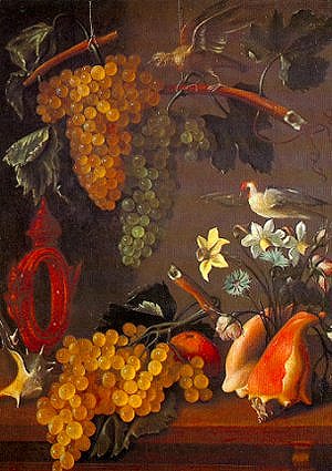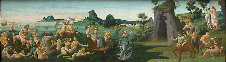 Elle rêva encore de raisin. C’est sans doute qu’elle aimait tant le raisin. Elle en vit dans une demeure qui ressemblait un peu à certaines parties de l’atelier de Gian Francesco, avec beaucoup de choses rassemblées, dont on se demandait ce qu’elles faisaient là ensemble. Et deux charmants petits oiseaux se délectaient de grappes, au milieu de tout cela. Elle n’entendit aucun chant. Le rêve lui offrit aussi de belles fleurs, une pomme, un objet dont elle pensa au réveil qu’il pouvait être fait de ce qu’on lui avait dit être du corail, venant de la mer. D’autres choses magnifiques venant de la mer étaient aussi dans ce rêve : de grands coquillages. Bien plus grands que ceux qu’elle pouvait admirer sur les rivages, le plus souvent, quand elle allait voir les ballets d’oiseaux (401). Puis, la mer fut là, juste après. Ce n’était plus du tout une demeure d’humain qui était dans sa tête, mais un grand cortège d’êtres sortant de la mer et abordant un rivage où Chiron était celui qui accueillait. Ah oui, Chiron lui avait parlé de ça. Thétys ! Les ruses de Chiron, enseignées à Pelée. Le mariage. Oh, elle avait certes oublié bien des choses. Mais le rêve lui montrait clairement son cher Chiron, d’autres centaures, des chèvre-pieds, beaucoup d’étonnantes naïades avec de belles mamelles. Il lui montrait Pelée, que Thétys était obligée d’accepter. Il lui montrait de turbulents centaures que Chiron ne pouvait tous surveiller. Et oui, Silène, toujours joyeux, et son âne aussi étaient là tous les deux, comme inséparables, forcément. Et oui, Hercule, sa peau et sa massue en bois d’olivier étaient là. Le rêve lui montrait beaucoup de très délicieux raisin. De très délicieux raisin. De très délicieux raisin (402,403).