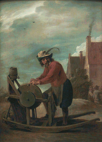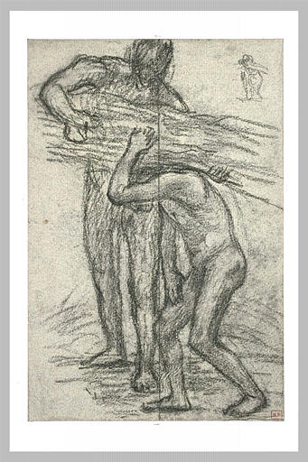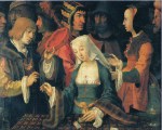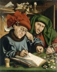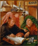 Bien sûr, Étiennette ne savait rien de La Louvre. Puis il se mit à penser – l’argent, l’argent – au rêve d’Anselme, ce vieux mendiant qu’il rencontrait assez souvent, circulant comme lui, de ce village vers la ville, de celle-ci vers telle autre, au gré de la pluie et du temps clément, avec le soleil au crâne, avec la boue aux pieds (428). Il avait parlé, oui, récemment de ces deux prêteurs aux coiffures si extravagantes, dans sa nuit (429). Ce vert, ce rose. Ils avaient ri ensemble. Et les grimaces. Et le même tas de pièces compté, plusieurs fois. Il avait décrit les visages et le livre de compte. Il avait dit, après ça, qu’il avait autrefois passé du temps chez les prêteurs, à demander un peu, à rembourser beaucoup, quand il était encore artisan, parce que ceci ou cela n’allait pas et qu’il fallait acheter du matériel pour l’atelier et payer les garçons. Mais qu’après, oui, il fallait tant redonner. Évidemment.