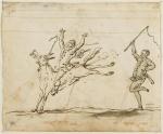 Il y a eu encore une sorte de polichinelle effrayé, sur le dos d’un âne – ou d’un mulet – qui ruait, pétait et pissait tout à la fois. Le polichinelle crie, lâche les rênes et le fouet de l’autre personnage masqué, juste derrière, s’active sur la croupe de l’animal. Il dit des choses drôles et se moque de polichinelle. Polichinelle secoue sa bosse et ne rit pas, lui (674).